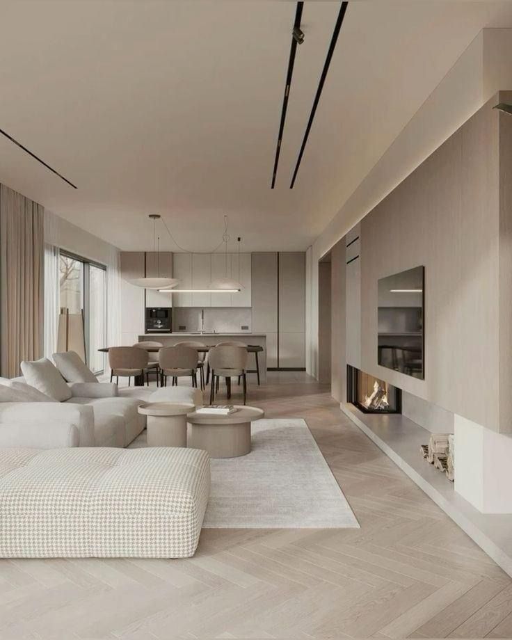 Matériaux de haute qualité comme le bois, le métal, le verre et le béton, avec des surfaces lisses et des finitions simples.