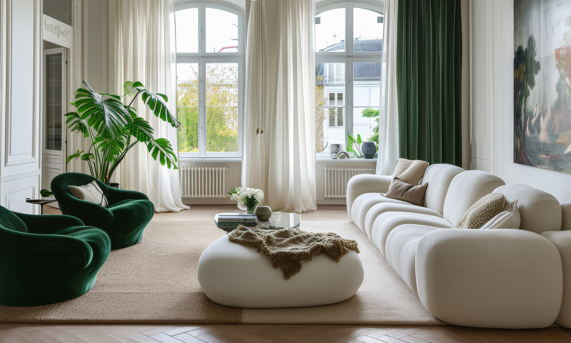 Accessoires limités mais soigneusement choisis, comme des plantes vertes et des vases en céramique