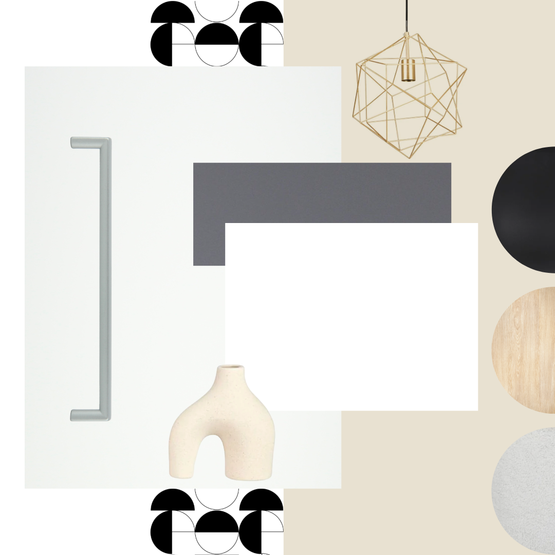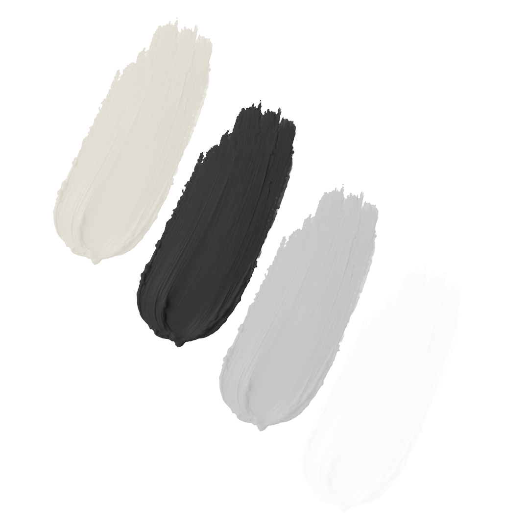 Palette de tons neutres : blanc, gris, noir et beige, avec des touches subtiles de couleurs douces.
