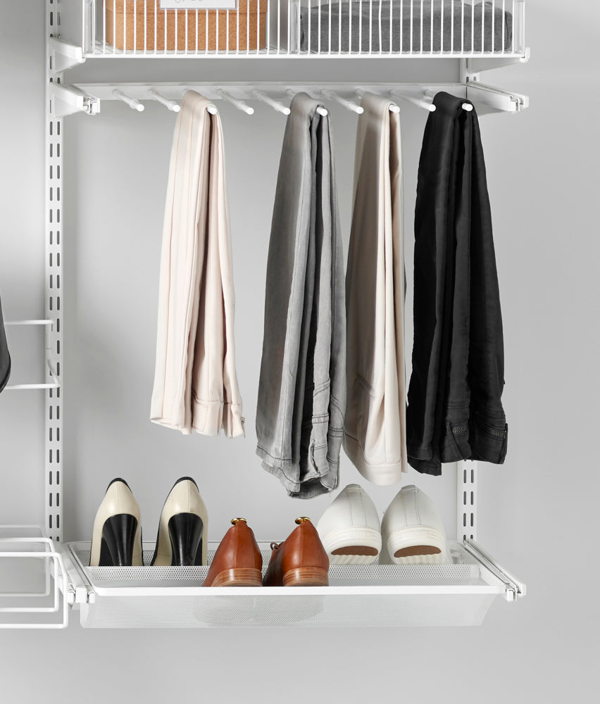 Une solution complète qui propose tout ce dont vous avez besoin pour une garde-robe multifonctionnelle et élégante. Les paniers filet et les tiroirs solides offrent un rangement ouvert et fermé, tous deux avec sortie totale et une fonction unique de fermeture en douceur. Les porte-chaussures, porte-pantalons et un porte-cravates et ceintures coulissant offrent des solutions intelligentes pour vos besoins de rangement.